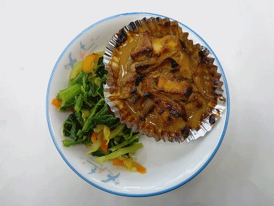 献立は、かきたま汁、ホキのみそマヨネーズ焼き、菜の花あえ、ごはん、牛乳、ココア牛乳のもとです。「ほき」はどんな魚かわかりませんが、みそマヨネーズ焼きはおいしかったです。ごちそうさまでした。
