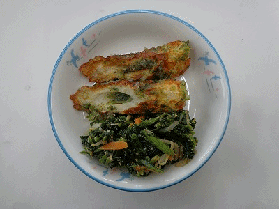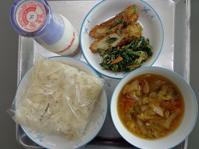献立は、きしめんの汁(確かにそうですが・・・)、ちくわの磯辺あげ、ごまあえ、きしめん、牛乳です。このきしめんは名古屋の人もきっと「うみゃー(うまい)」というでしょう。