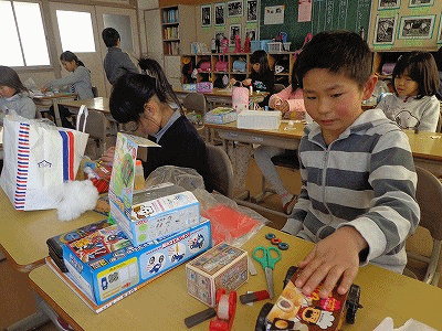 今までに学習した風、ゴム、電気、磁石などを動力としたおもちゃを作ってます。楽しいアイデアいっぱいです。