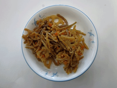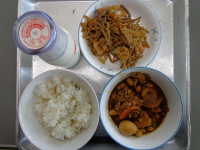 献立は、鉄火みそ、れんこんきんぴら、麦ごはん、牛乳です。鉄火みそは濃厚な味わいでした。