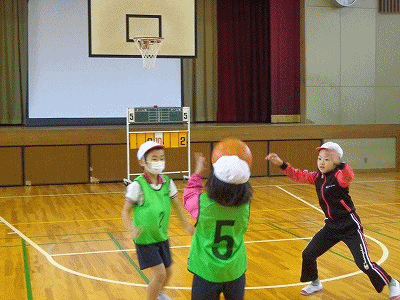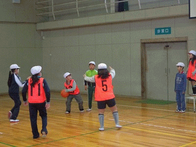 「ポートボール」の授業です。チームでパスを回しながら、ガードマンにとられないようにゴールマンにパスをして得点です。なかなかゴールマンまでパスが通りません。
