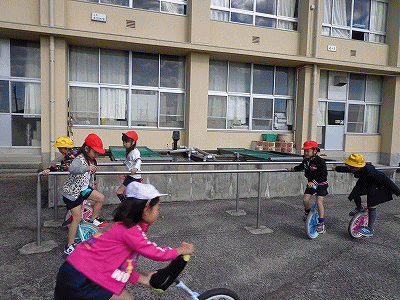 風は冷たいですが、春の日差しです。1年生の一輪車もずいぶん上達しました。