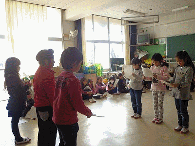 送る会の練習です。分担を決めて、シナリオ通り演技やせりふを入れていきます。1年生らしい、かわいらしい発表になりそうです。お楽しみに。