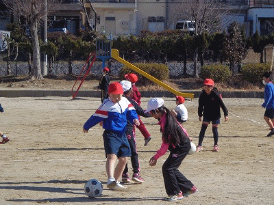 試合を間近に控え、練習にも熱が入ります。鬼にボールを取られないように、味方にパスを出します。試合にそのまま使えるテクニックです。