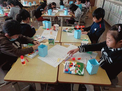 6年生にプレゼントする花の苗を入れるカバーを牛乳パックで作りました。「卒業おめでとう」の言葉を入れ、それぞれがきれいに絵を描いたり色をぬったりして仕上げます。6年生、喜んでくれるかな?
