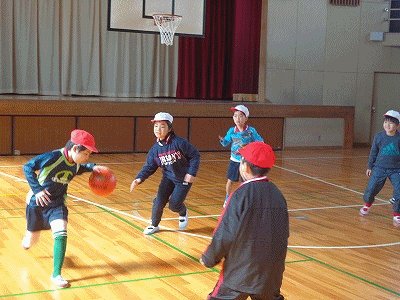 ポートボールの試合です。ボールを持って3歩歩いてはいけませんが、それがなかなか難しいです。パスを出してボールを回して、何とかゴールマンにボールを届けたいです。