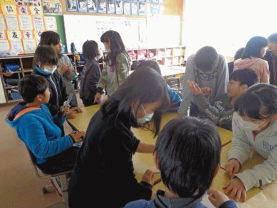本校の特色であるキャリア教育の取組の一つとして、今日は5年生が貿易ゲームに取り組みました。アイテムがそろわない中、各班で相談し、他の班と交渉をすることでいろんなアイテムをゲットして、製品作りに取り組むことができました。