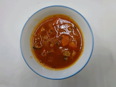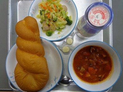 献立は、鶏肉と野菜のトマト煮込み、ブロッコリーのサラダ、ツイストロール、牛乳、キャンディーチーズです。