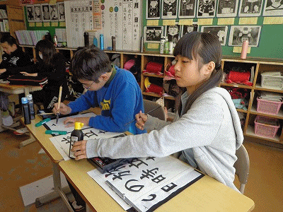 「旅立ちの時」……今の時期にピッタリの字です。一画一画、心に刻み込むように書いていきます。