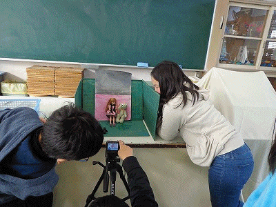 「コマコマアニメーション」の撮影です。少しずつキャラクターを動かして、デジカメで撮影していきます。どんなアニメーションになるか楽しみです。