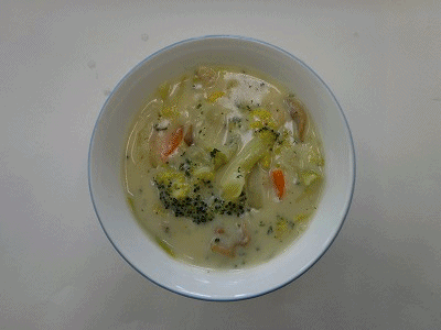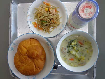 献立は、白菜とブロッコリーのシチュー、ごぼうサラダ、りんごパン、牛乳です。