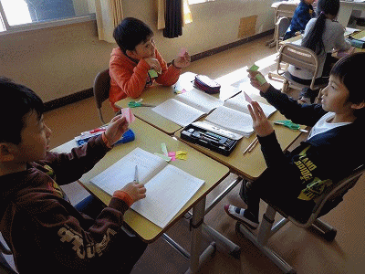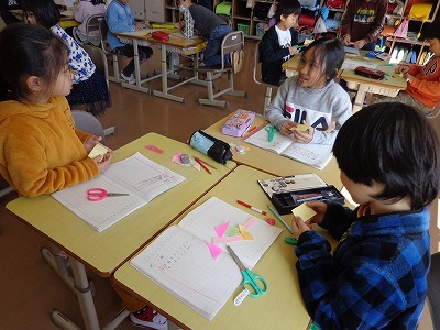 分数の学習です。様々な図形を半分にして、2分の1を作っています。