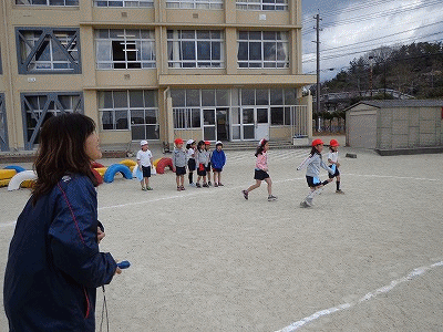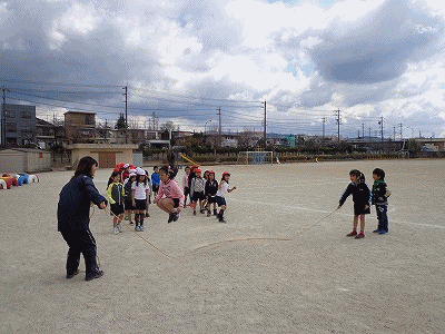 大縄跳びは、まだまだ怖くて飛び込めない子がいます。頑張って!そのあと、タグラグビーの入門として、腰から下げたタオルを取るゲームをしました。