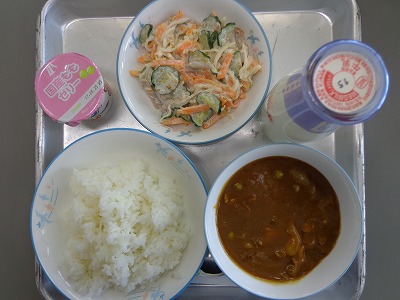 献立は、カレー、切り干し大根サラダ、ごはん、牛乳、ももゼリーです。