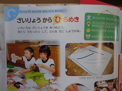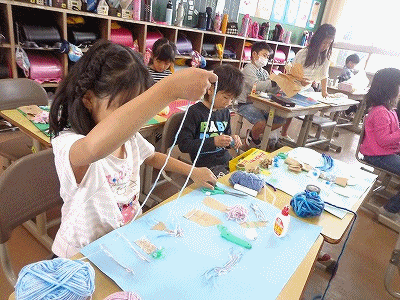 「ざいりょうからひらめき」の単元です。紙テープやビニールテープ、毛糸や新聞、模造紙などを使って、おもいおもいの作品を作ります。どんな作品ができるかな?