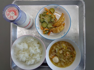 献立は、八宝菜、揚げぎょうざ、ナムル、ごはん、牛乳です。