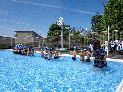 気持ちのいい梅雨の晴れ間の水泳の授業です。まだ水は冷たいですが、しっかり水中で体を動かします。