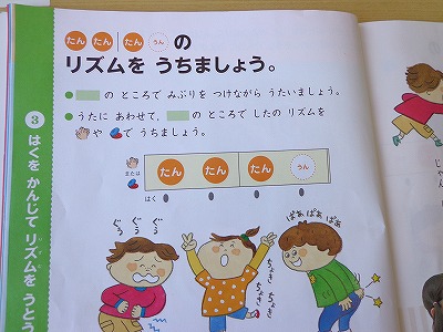 かすtがネットを使って、リズムを打つ練習をしました。歌いながらカスタネットを叩いて、最後にジャンケンをしました。