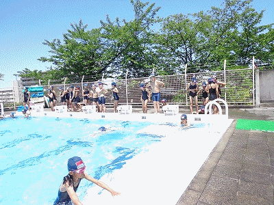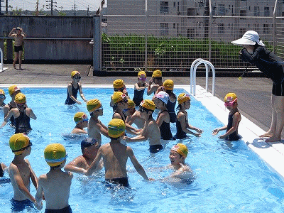 こちらもプールです。梅雨の晴れ間の強くなってきた日差しのもと、早く水に慣れ、スイスイ泳げるようになるまで頑張ります。