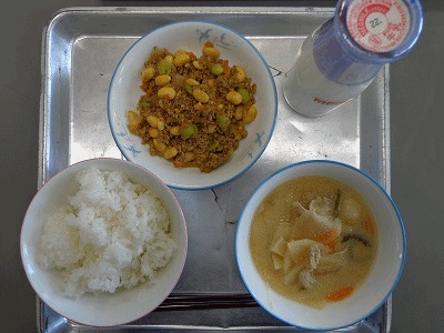 献立は、洋風団子汁、ピリ辛大豆、ごはん、牛乳です。