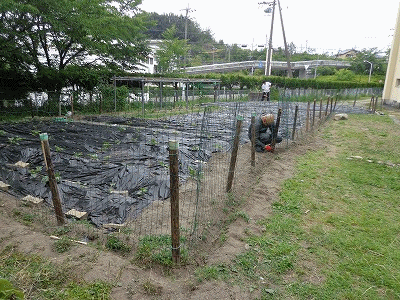 八幡屋の大切なさつまいもを守るために、岡田先生と池さんががんばって柵を作っています。もうすぐ完成です。