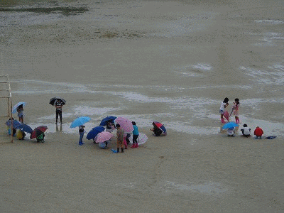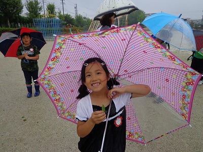 雨でできた水たまりに葉っぱを浮かべて遊びました。