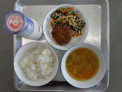 献立は、とうがん汁、照り焼きハンバーグ、千草あえ、ごはん、牛乳です。