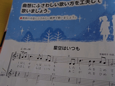 リコーダーの練習です。「星空はいつも」を表情をつけて演奏します。2人組で聞き合ってアドバイスをしあいます。