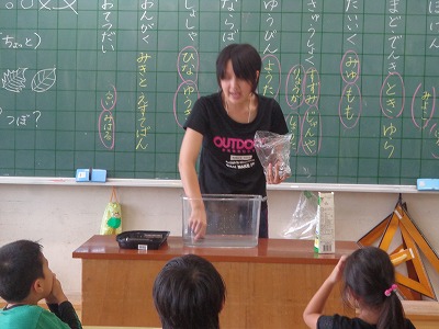 ザリガニのおうちを作っています。おうちを作っている間、ザリガニは牛乳パックで待っています。