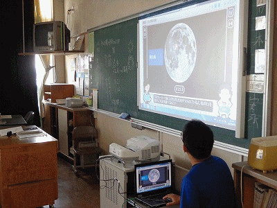 「太陽と月の形」の単元です。電子黒板を使って、月の様子を観察します。「カニ」に見えるか、「本を読む少女」に見えるか、「うさぎ」に見えるか、意見が分かれます。