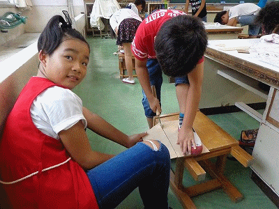 2組の「ギコギコクリエーター」です。のこぎりを使うには力が要ります。本当にケガだけは注意してほしいです。