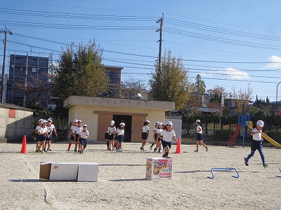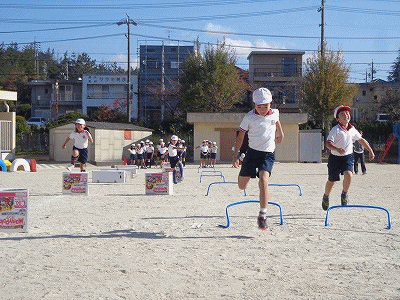 こちらはハードル走です。あまり高くないハードルや段ボールを使って、ハードル走の基礎を練習します。
