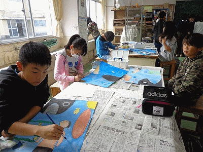 読書感想画「海の命」の仕上げです。海底の世界がうまく表現できたかな?