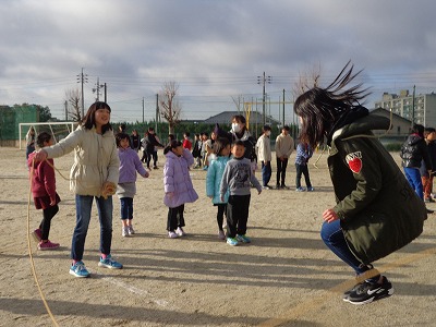 今年は、縦割り班で大なわとびをします。みんなで力を合わせて楽しむことを目的とします。