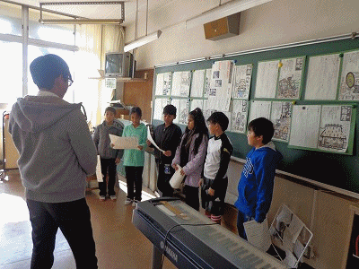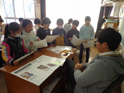 足助屋敷で見学したことを新聞にまとめました。その発表の練習です。熱心に取り組んでいます。