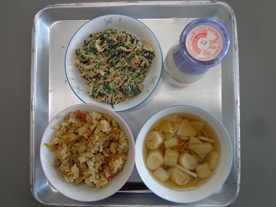 献立は、ふだま汁、ごまあえ、とりめし、牛乳です。今日もおいしい給食です。