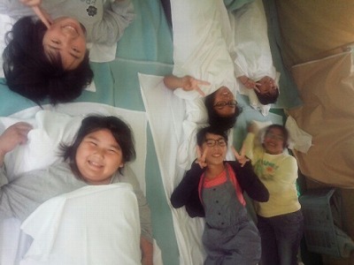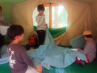 テントの中で、毛布をセット。協力して敷いていますね。