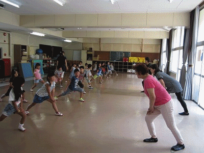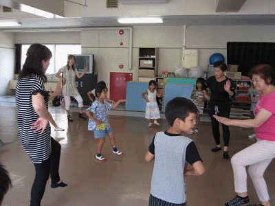 地域の方が講師となり、盆踊りを教えてくださいました。まずは、準備運動。それから、踊りの練習です。今日は、2回目ということで、子どもたちも上手に踊れるようになりました。