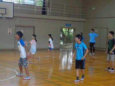 体育館でお楽しみ会です。先生もいっしょになってドッジボールをしています。