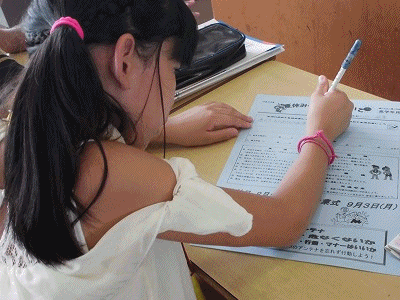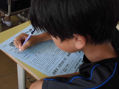 夏休みの生活についてのプリントをもとにていねいに確認しています。その後、それぞれの生活目標を考えて記入していました。