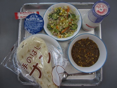 1学期最後の給食です。献立は、ドライカレー、イタリアンサラダ、ナン、牛乳、アイスクリームです。「アイスクリームが出るから」と、午前中がんばっていた子どもたち。あと少しで、1学期の授業も終了です。