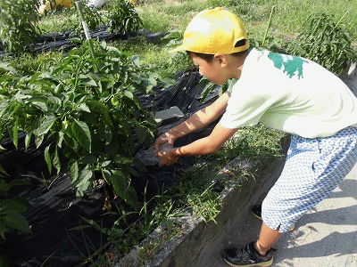 生活科で育てている自分の野菜にペットボトルで水やりをしています。