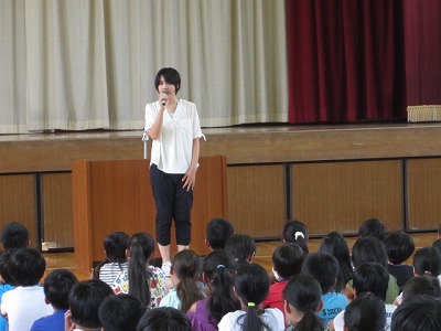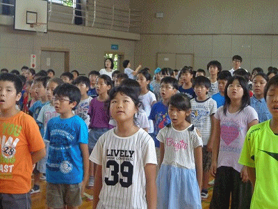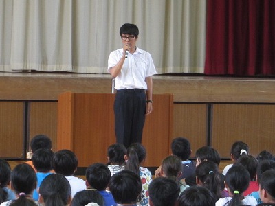 村山先生からは交通安全について、矢壁先生からは夏休みの生活についてそれぞれ話がありました。その後音楽部の演奏で校歌を歌いました。
