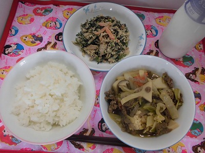 献立は、すき煮、五色(ごしき)あえ、ごはん、牛乳です。