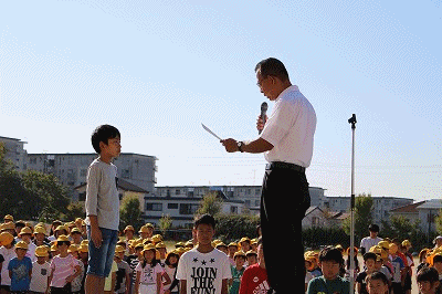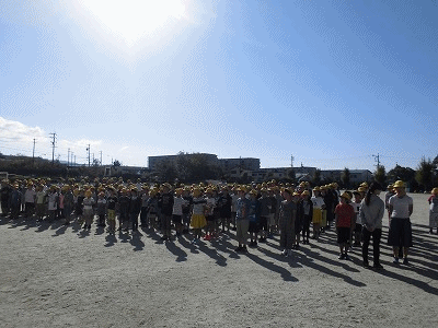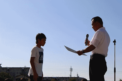 読書感想文コンクールの入選者とサッカー部の表彰を行いました。その後、交通安全担当の村山先生から交通安全に関する話がありました。