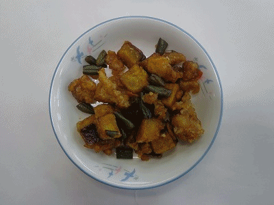 今日の献立は、なめこのみそ汁、さつまいもと鶏肉の照り煮、わかめごはん、牛乳、アーモンド小魚です。ついつい、おかわりしそうです。