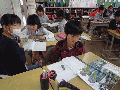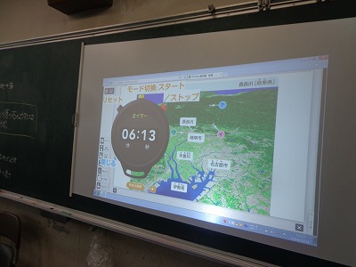 流れる水の働きについて学習しています。資料の中で「ストップウォッチ」が動いています。みんなこの時間を気にしつつ話し合いを進めています。