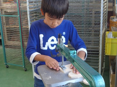 テープカッター作りです。板に下書きをしたら「一発勝負」でカットします。
