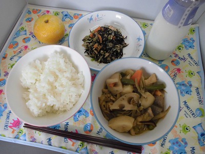 献立は、筑前煮(ちくぜんに)、ひじきとツナのあえもの、ごはん、牛乳、みかんです。今日のみかんは、冷凍ではありません!