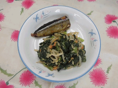 献立は、すまし汁、さんまの梅煮、小松菜のごまあえ、栗入りごはん、牛乳です。栗入りごはんには栗がたっぷりと入っていました。